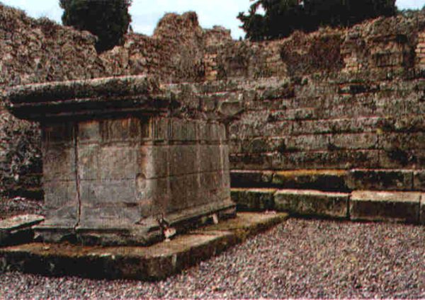 Tempel des Aesculapius & der Salus In der Cella gab es an der Rückseite einen länglichen Sockel für die Kultstatuen. Zur Innendekoration gehörte wohl ein aufgefundenes korinthisches Kapitell mit Iuppiterkopf. Die Kapitelle sind schwer datierbar, werden jedoch allgemein eher in das 2.Jh.v.Chr. datiert, als in sullanische Zeit. An Kultstatuen aus Terrakotta fand man eine des Aesculapius und eine der Salus sowie eine Büste der Minerva. Sie tragen alle hellenistische Züge. Die Hauptstatue wird in das 3.Jh.v.Chr. datiert, die anderen der sullanischen Zeit zugerechnet. Möglicherweise war vor der Weihe an die beiden Heilgottheiten die Anlage tatsächlich dem Zeus Meilichios geweiht und war im 1.Jh.n.Chr. dann den Erfordernissen einer neuen Zeit angepasst worden. Die späteren, bis in die Kaiserzeit reichenden Kleinfunde belegen, dass sich der Tempel einer grossen Beliebtheit vor allem der weniger begüterten Pompejaner erfreute. Der Tempelaltar aus Noceratuff inmitten des Hofes verfügte über zwei ionischen pulvini (polsterartige Voluten) sowie über ein Metopen- und Triglyphenfries. Als Entstehungszeitraum werden sowohl das 3. als auch das 2.Jh.v.Chr. genannt. Interessant ist der Gesamteindruck, da er stark an den Sarkophag des Cornelius Scipio Barbatus in Rom erinnert. Wohl haben beide das gleiche hellenistische Vorbild in Süditalien. Der Cerestempel Für Pompeji ist ein Cereskult mit einer sacerdos publica Cereris (Priesterin der Ceres) nachgewiesen. Umso erstaunlicher mutet es an, dass man den zugehörigen Tempel noch nicht gefunden hat. Entweder lag er in den wenigen noch nicht ausgegrabenen Teilen der Stadt oder man hatte ihn ausserhalb der Mauern errichtet. Letzteres ist mit höchster Wahrscheinlichkeit anzunehmen, da es für griechisch dominierte Städte durchaus üblich war den Cerestempel abseits der Zentren zu errichten. |